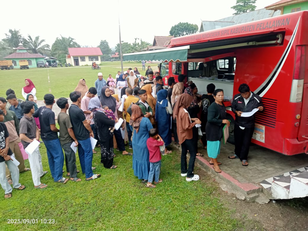 RIAU (LK) – Guna memperbaiki dan meningkatkan kualitas layanan administrasi kependudukan, Dinas Kependudukan dan Pencatatan Sipil (Disdukcapil) Kabupaten Pelalawan jalankan program pelayanan jemput bola ke daerah terpencil, salah satunya di Desa Genduang, Kecamatan Pangkalan Lesung.