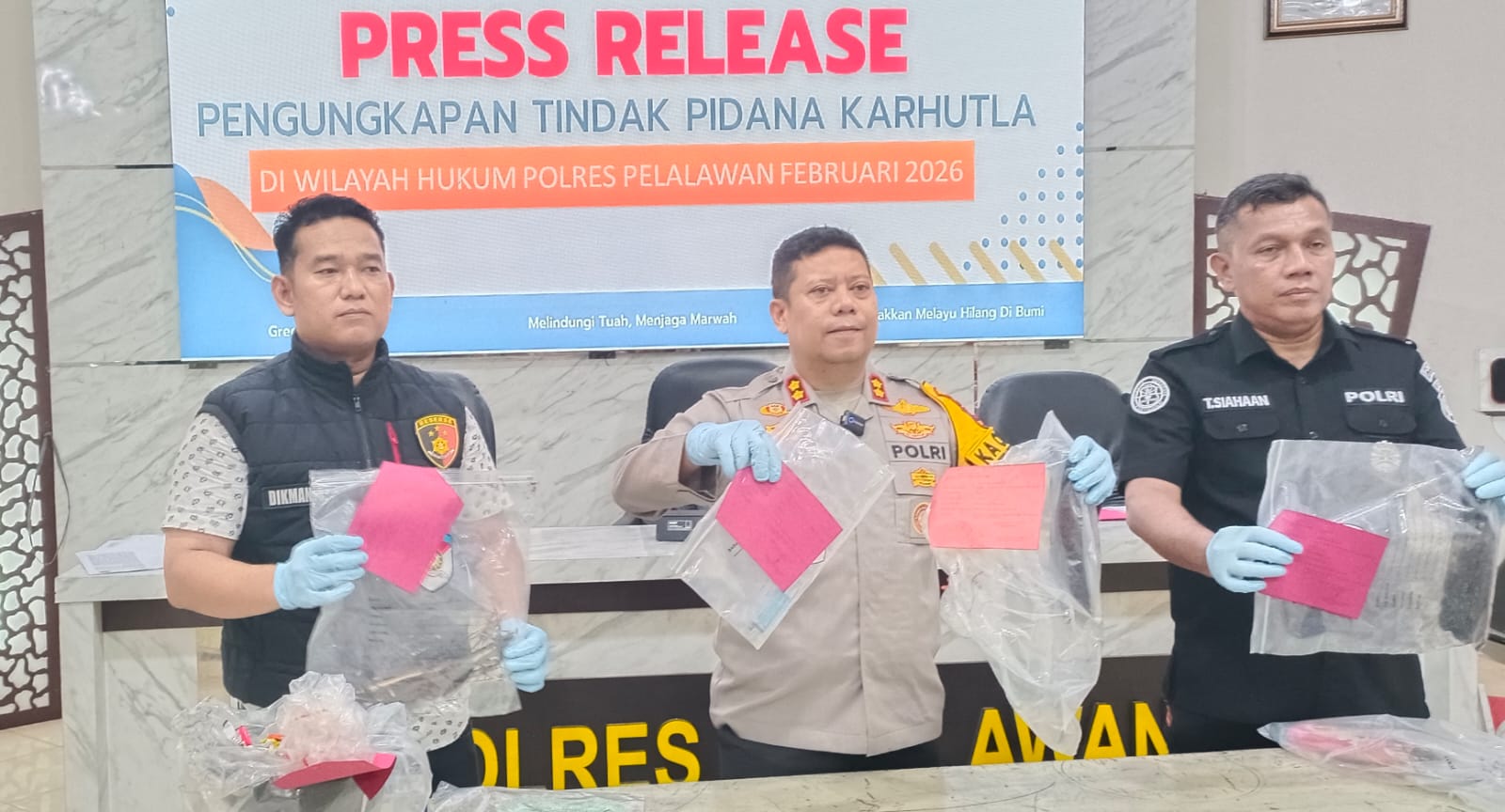 RIAU (LK) – Kepolisian Resort (Polres) Pelalawan terus berkomitmen dalam penegakan hukum terhadap pelaku kebakaran hutan dan lahan (Karhutla). Hal ini dapat dilihat dari keberhasilan mengungkap tiga kasus karhutla di wilayah Teluk Meranti dan Kuala Kampar dengan mengamankan empat orang tersangka.